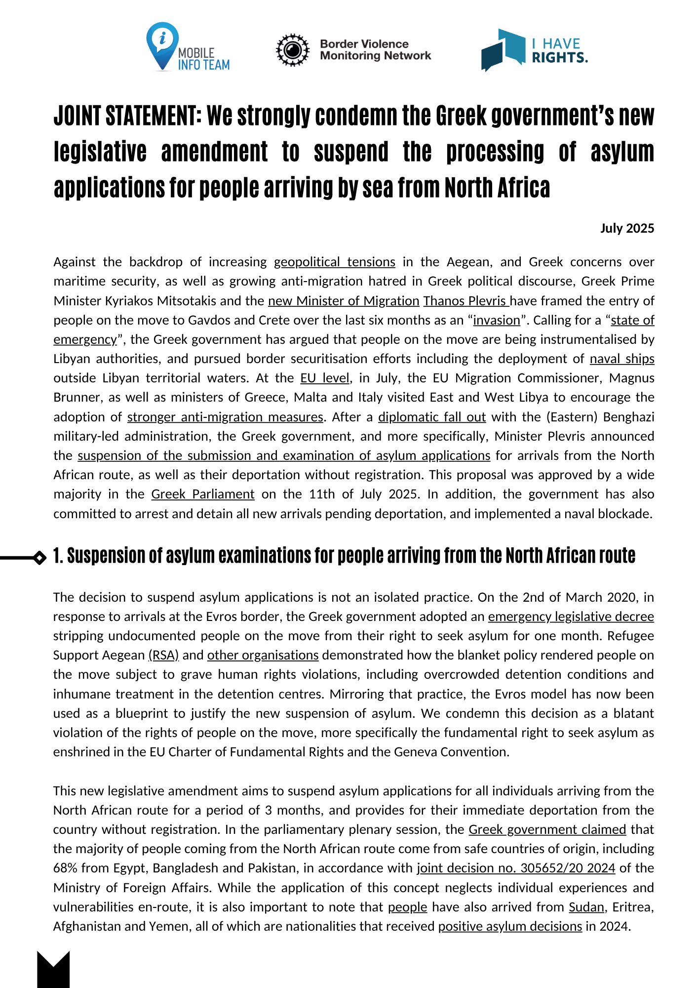 On the 9th of July, Greece’s new Minister of Migration and Asylum, Thanos Plevris, announced the suspension of the submission and examination of asylum applications for arrivals from the North African route, as well as their deportation without registration. This proposal was approved by a wide majority in the Greek Parliament on the 11th of July 2025. In addition, the government has also committed to arrest and detain all new arrivals pending deportation, and implemented a naval blockade.